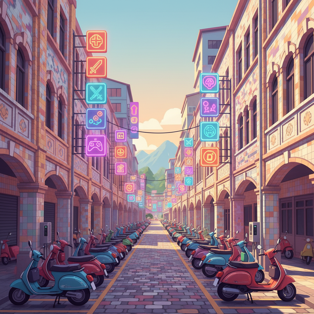 Open the game today and you might blink. Buildings now wear Taiwan tile facades — creamy white, soft pink, pale yellow. There are arcade awnings over the sidewalks. And tucked neatly beneath them: twenty-eight scooters, parked in a row.