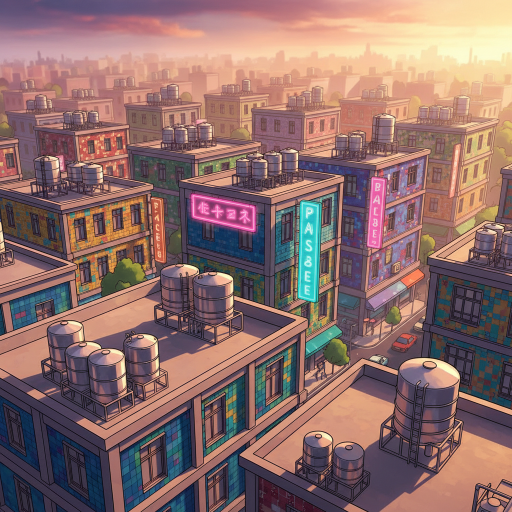 !Rooftop view of Taiwan city with stainless steel water tanks on colorful tile-facade buildings
